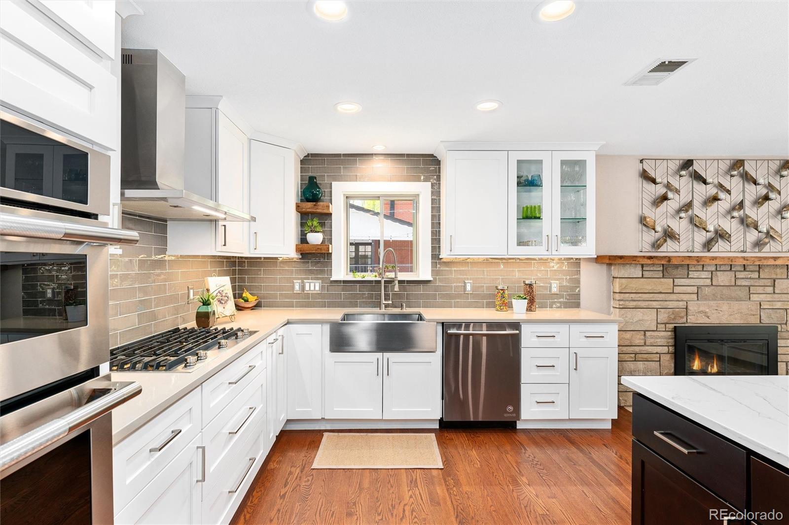 Welcome to this stunning 4-bedroom, 3-bathroom ranch-style home nestled on a generous 13,464-square-foot lot in Applewood. Recently redesigned and remodeled, this residence spans over 3,400 square feet, showcasing impeccable craftsmanship throughout. As you step inside, the open concept floor plan greets you with an abundance of natural light filtering through large windows. The original wood flooring adds warmth and character to the space. The heart of the home is the modern eat-in kitchen, featuring JennAir stainless steel appliances, a striking tiled backsplash, and custom white shaker cabinets. Adjacent to the kitchen, the dining area has its own gas fireplace, while the living room, complete with built-ins, invites relaxation and conversation. But the real showstopper awaits outdoors. Step onto the covered deck and take in panoramic views of the mountains and Maple Grove Reservoir. The main level hosts the primary bedroom suite, a true retreat. The updated primary bathroom features a walk-in closet, skylight, heated floors, and a luxurious 2-person shower. A second bedroom on this level also has its own beautifully tiled bathroom with an oversized walk-in shower. Heading downstairs, you'll discover a separate living area with a fireplace and a walk-out private patio that's pre-wired for a hot tub. Two additional spacious bedrooms on the lower level share a jack-and-jill full bathroom, each with its own vanity. Additional recent upgrades include the electric panel, electrical wiring, central A/C, water heater, deck, roof, JennAir kitchen appliances, smart sprinkler system, and gutters. This home is ideally situated within walking distance to Stober Elementary and Maple Grove Reservoir. Plus, it's just minutes away from downtown Golden, I-70, Life Time Denver West, and the future site for SCL Health Lutheran Medical Center. Don't miss the opportunity to make this Applewood gem your own.